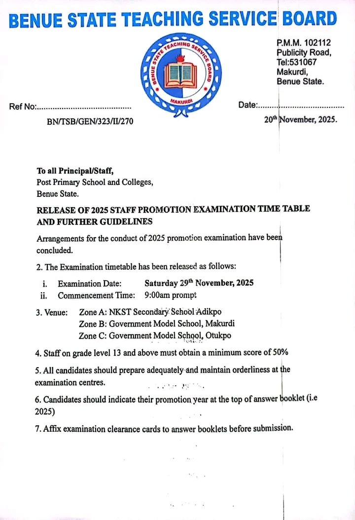 Benue State Teaching Service Board 2025 Promotion Exams Timetable