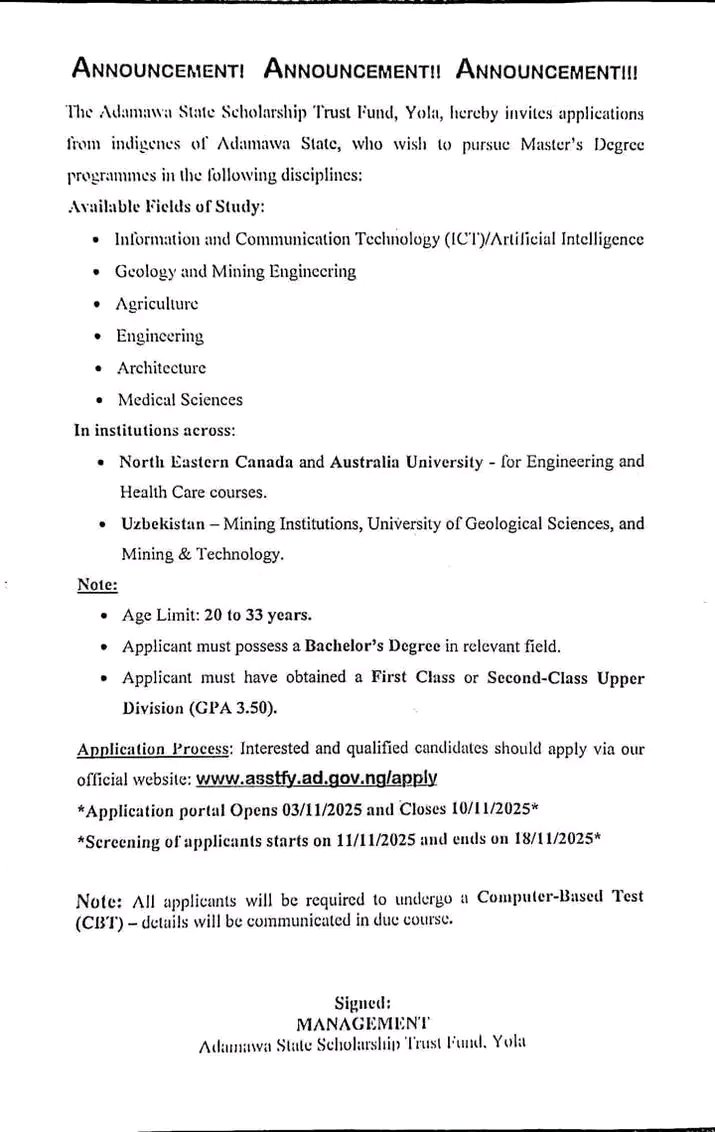 Link to Apply for Adamawa State 2025 Masters Scholarship. The Adamawa State Scholarship Trust Fund, Yola, invites applications from indigenes of Adamawa State who wish to pursue Master’s Degree programmes in reputable institutions abroad.