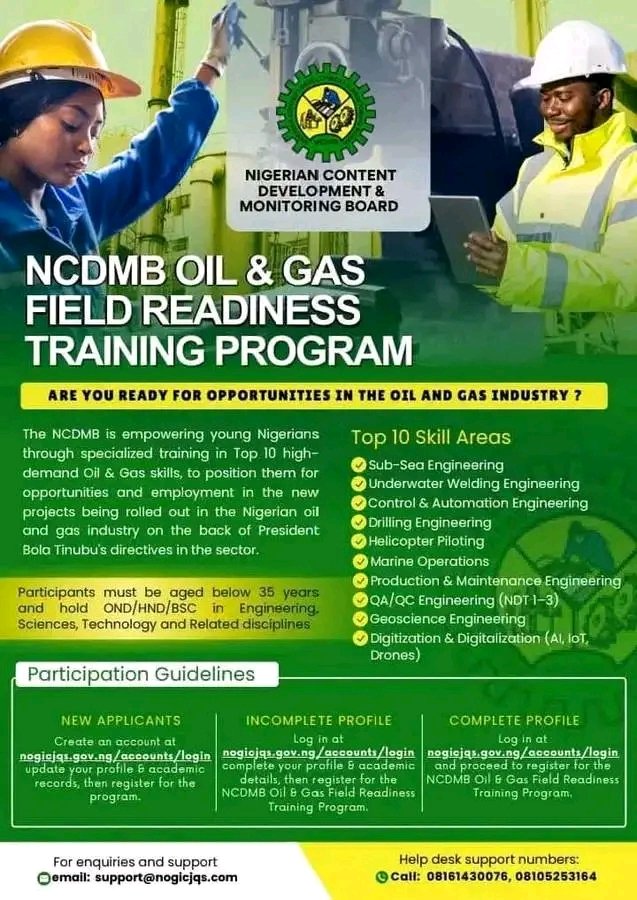 Job Vacancies2 Min Read JobmetricsonNovember 1, 2025 Link to Apply for NCDMB Oil & Gas Field 2025 Training Program Applications are hereby invited from suitably qualified candidates for the Nigerian Content Development and Monitoring Board (NCDMB) Oil and… Discover More