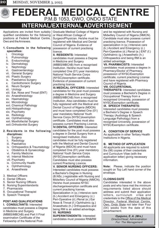 Job Vacancies1 Min Read JobmetricsonNovember 7, 2025 Apply for Federal Medical Centre Owo 2025 Job Vacancies The Federal Medical Centre (FMC), Owo, Ondo State invites applications from suitably qualified candidates for the following available job… Discover More