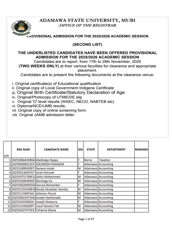 Education1 Min Read JobmetricsonNovember 7, 2025 Adamawa University Mubi Second Batch Admission List 2025/2026 The management of Adamawa State University, Mubi wishes to notify the general public, particularly prospective students, that the provisional… Discover More