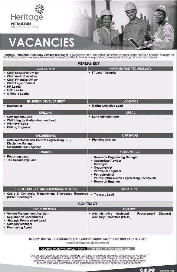 Job Vacancies3 Min Read JobmetricsonNovember 7, 2025 Link to Apply for Heritage Petroleum Company 2025 Recruitment Heritage Petroleum Company Limited, a fully state-owned enterprise engaged in the exploration, development, and production of crude oil, is… Discover More