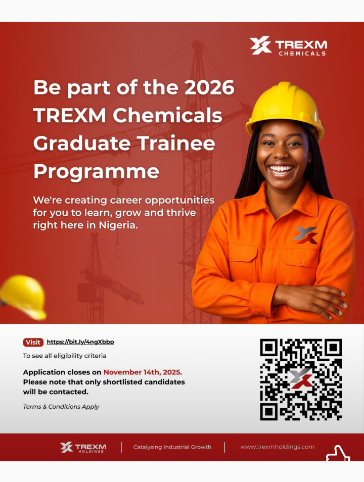 Job Vacancies1 Min Read JobmetricsonOctober 26, 2025 Link to Apply for TREXM Chemicals Graduate Trainee Program 2026 Link to Apply for TREXM Chemicals Graduate Trainee Program 2026. TREXM Chemicals is inviting application from suitably qualified candidates… Discover More